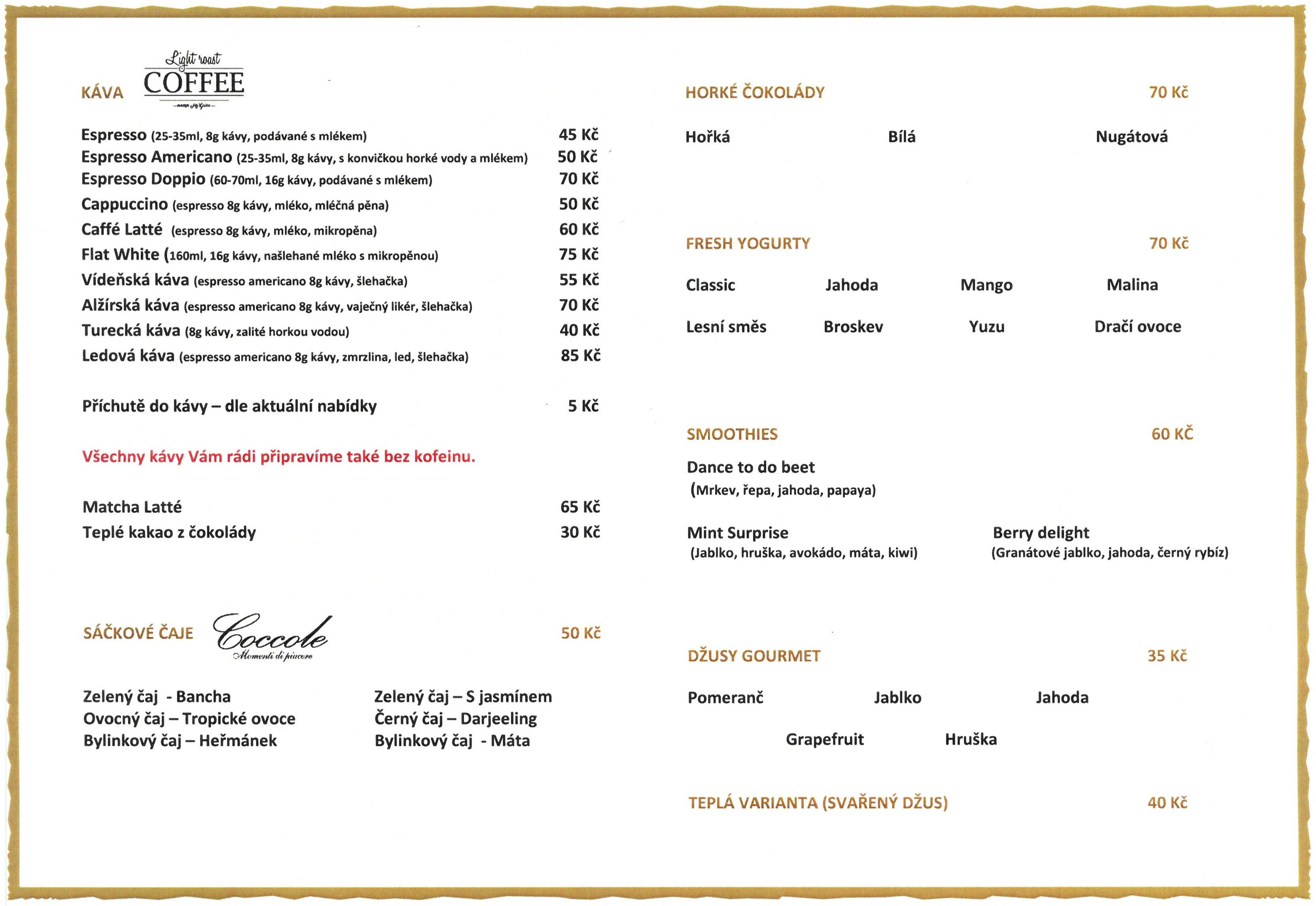 Nabízíme prémiovou italskou kávu, výběrový čaj, horkou čokoládu, domácí limonády, smoothies, fresh jogurt, víno a mnoho dalšího.