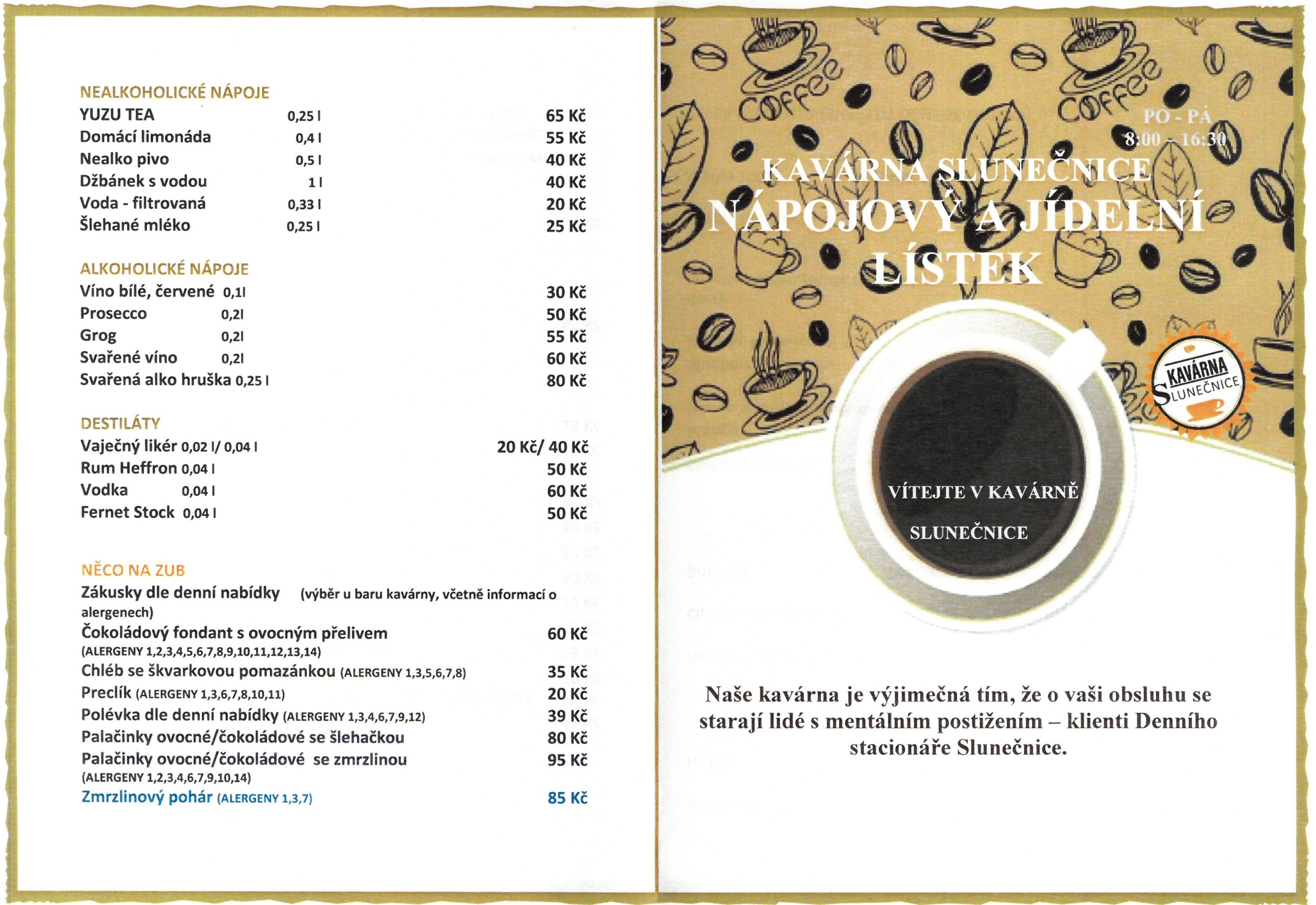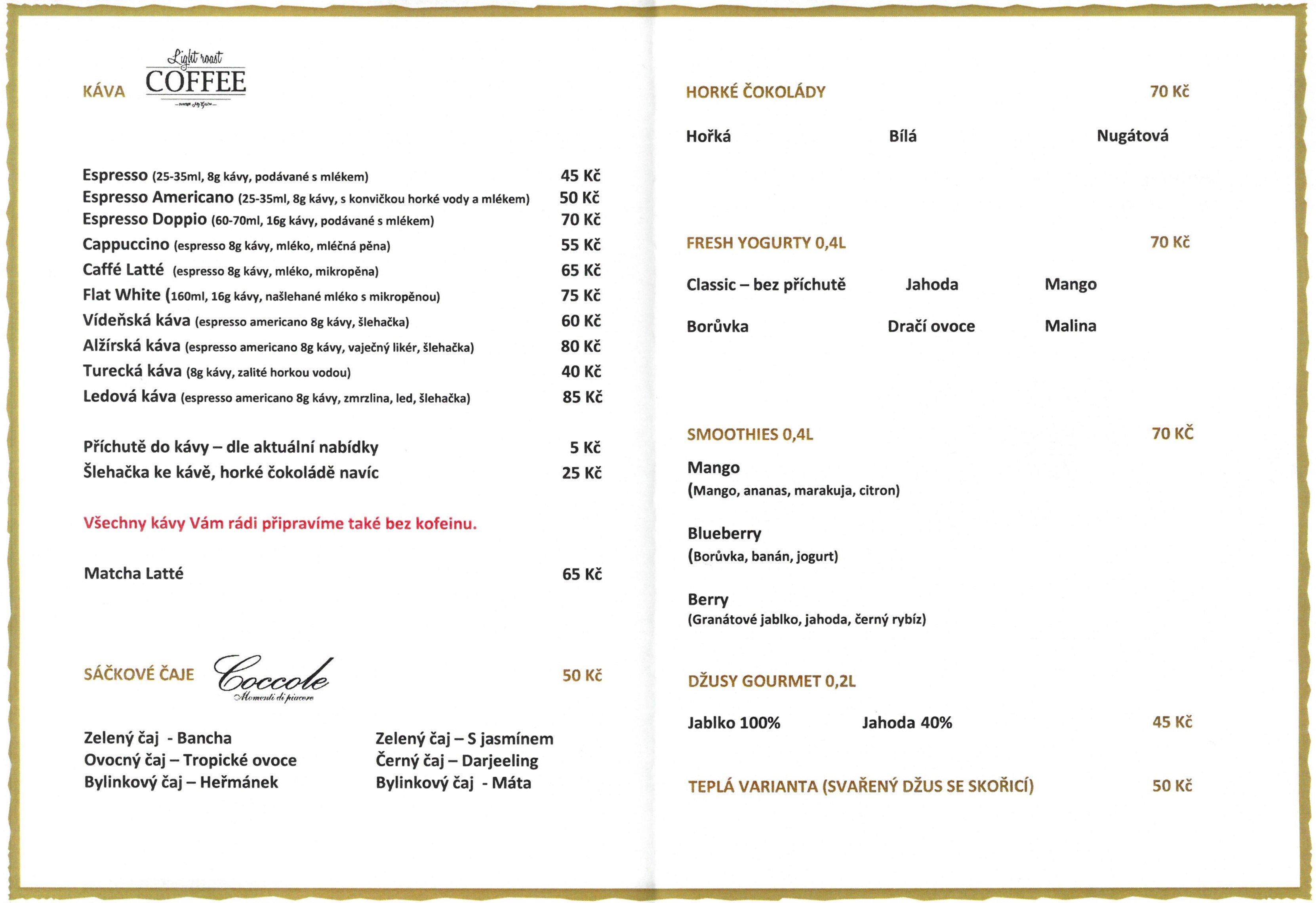 Nabízíme prémiovou italskou kávu, výběrový čaj, horkou čokoládu, domácí limonády, smoothies, fresh jogurt, víno a mnoho dalšího.